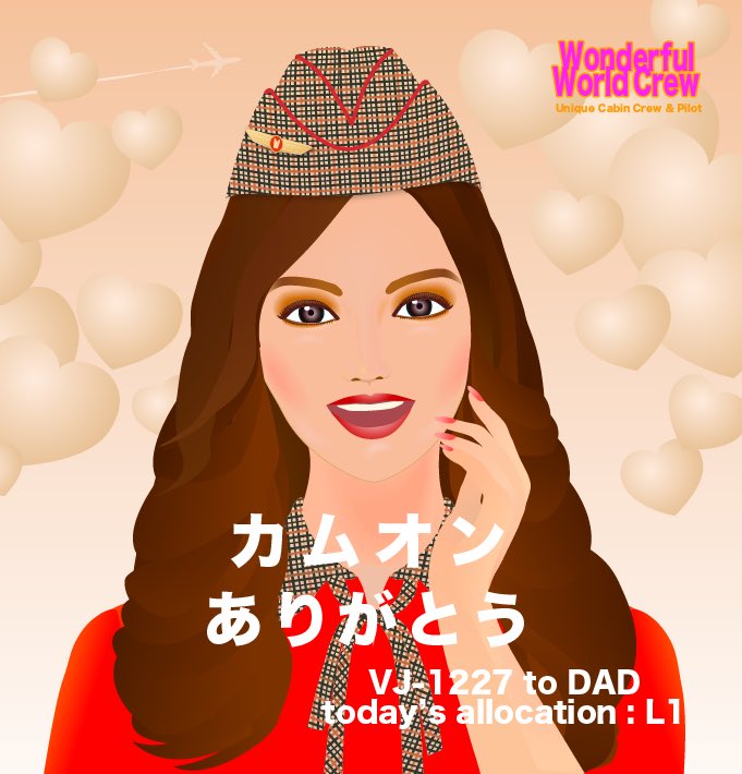 NFTアートでみんなを元気にしたいプロジェクト 『Wonderful World Crew』 応援よろしくお願いします✈️❣️ 今日のNFTは ベトジェットエアの制服を着た ダナン国際空港行き便の CAのLanちゃんを描きました #NFTs #NFTCommunity #nftart #NFTartist #イラスト #nftcollector #NFTCollection #art #CA
