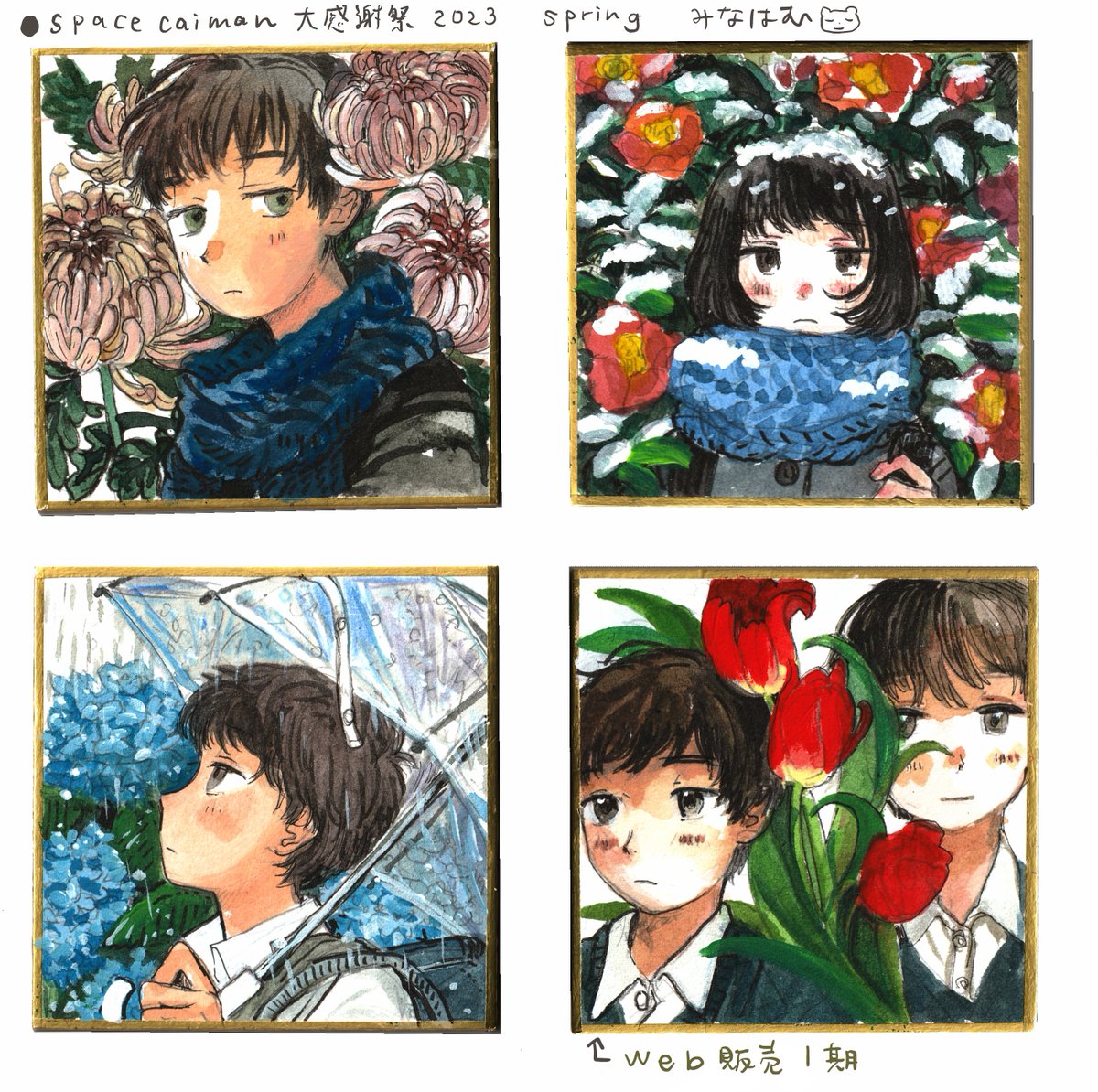 #caiman大感謝祭2023春 私の描いたミニ色紙は菊、椿、紫陽花、チューリップの4枚で、全て会場でご覧いただけます。購入はチューリップの絵のみweb販売、その他の3枚は会場販売だそうです。 2枚目は私がさっき勝手に色紙の人を描いた絵です。