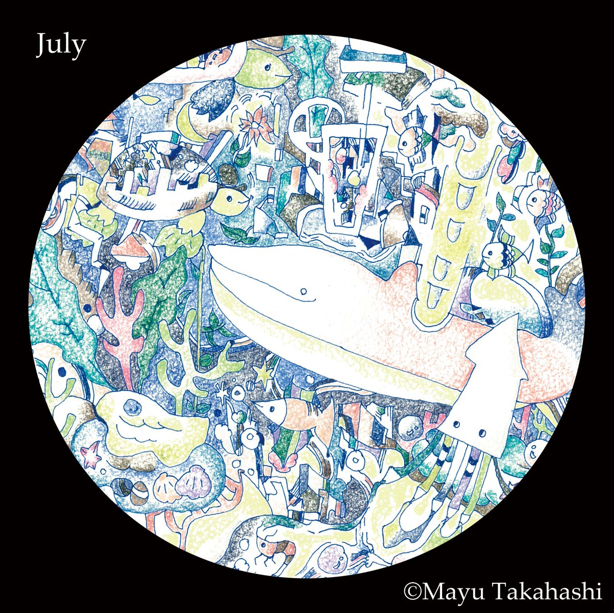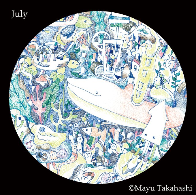 つづいては7月の画像の一部です。描いていたら、やさしい表情のピンクくじらさんと手足が色えんぴつになっているイカさんが登場してきました。こんな海があったら楽しそうだ😊 #illustration #colorpencil #絵描きさんと繫がりたい #calendar2022