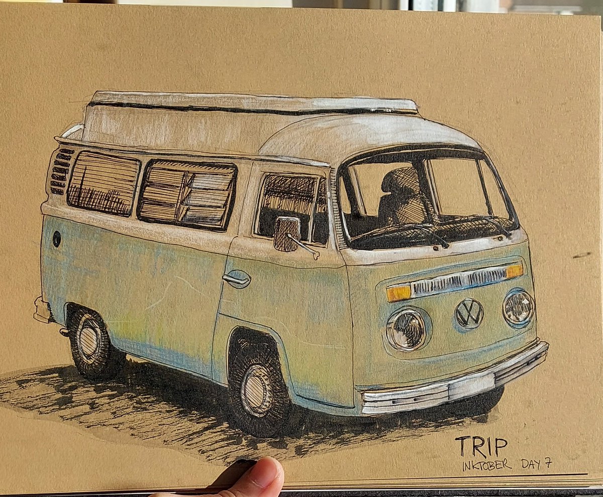 Here is my 7th #Inktober #sketch for "trip". The van belongs to @flipside666. #inktober2022 #inktoberday7 #campervan #vehicleart #twitterart