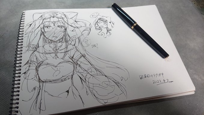 【本日のラクガキ(作業風景)】本日ラクガキはセリアのスケッチに万年筆で一発描きで描いています。また、イラストの取り込みはアプリ「CamScanner」を使用しています。 #民族衣装 #絵描きさんと繋がりたい #猫耳 #風景画 #ラフ #アナログイラスト #万年筆 #CamScanner