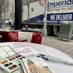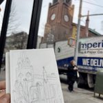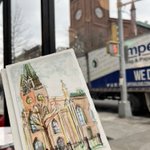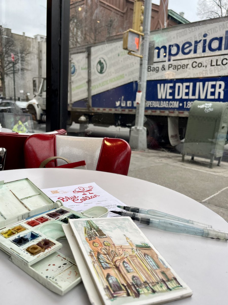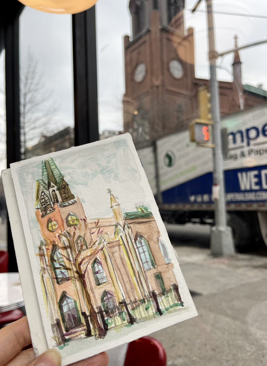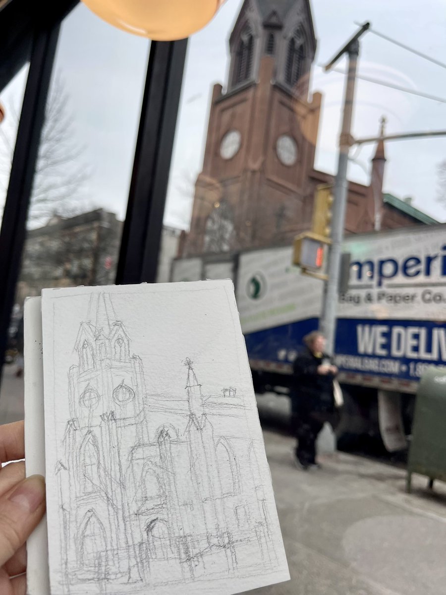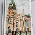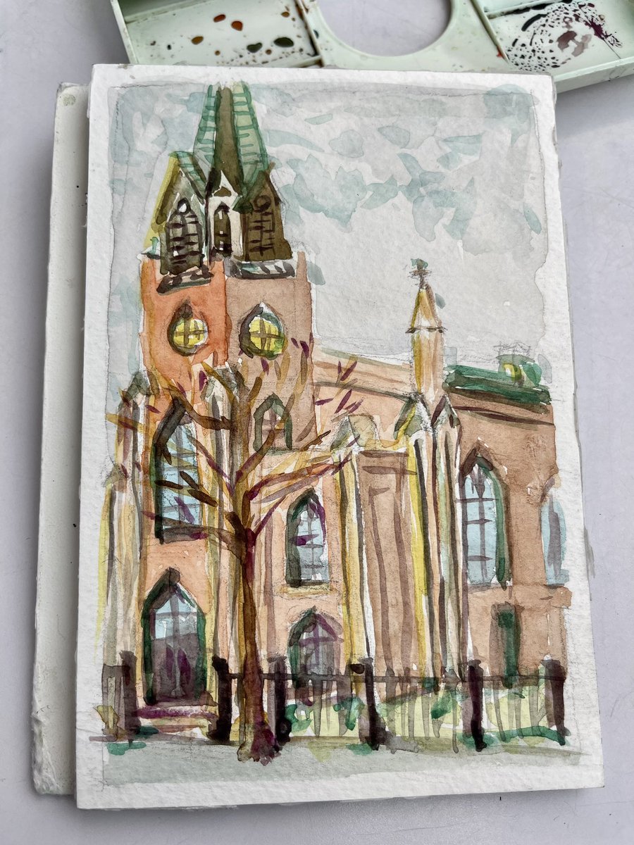 The view of St Paul’s Roman Catholic Church from a hamburger shop。同じ教会をハンバーグ屋から描きました。途中で目の前に大型トラックが停まって下半分見えなくなりました。 #つらら庵お散歩スケッチ #winsorandnewtonwatercolors #cansonpaper #bluecollarburgers #stpaulsromancathoricchurch