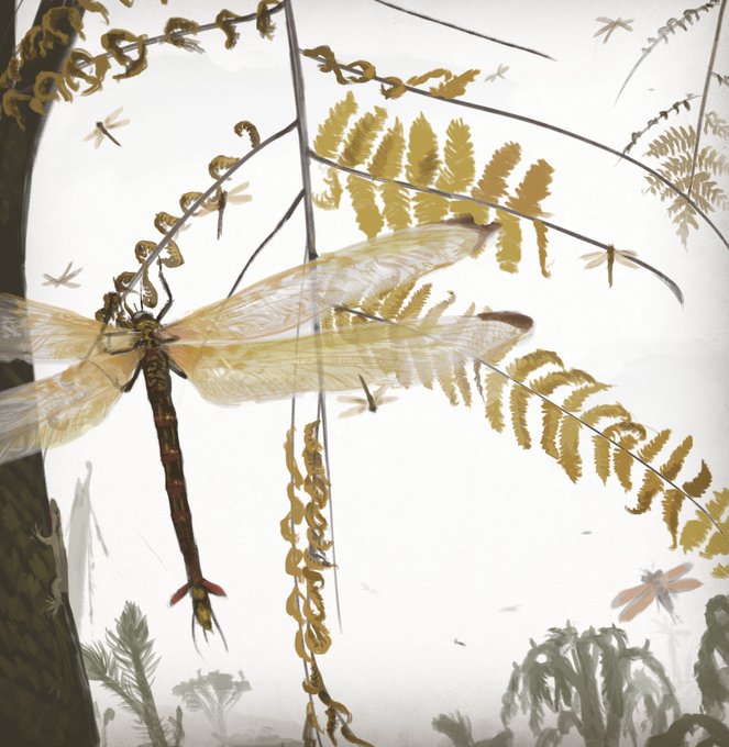 Another carboniferous painting, going for something more stylized this time #art #digitalart #illustration #insect #paleoart #carboniferous #meganeura #griffinfly #lepidodendron #scaletrees #clubmosses #paleozoic #Palaeozoic