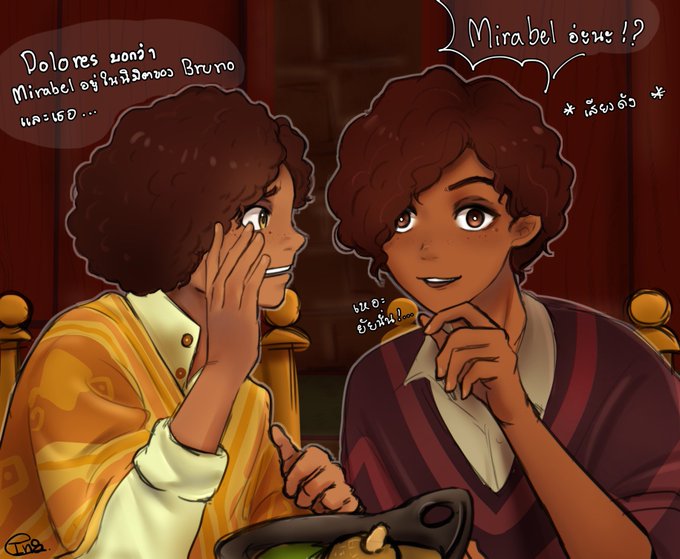 เหตุการณ์บนโต๊ะอาหาร คามิโล่กระซิบบอกคาร์ลอสเรื่องนิมิตของบรูโน่ด้วยสีหน้ากังวล แต่คาร์ลอสกลับทำสีหน้าเหมือนกำลังรู้สึกสนุกอยู่😆 (ฝาแฝดAU) #encantofanart #camilomadrigal #carlosmadrigal