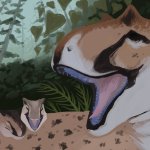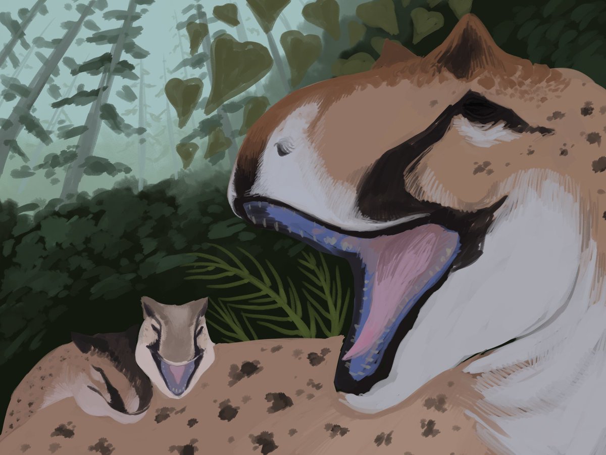 A carnotaurus and her young take a nap in the shade of trees #Dinosaur #carnotaurus #paleoart #digitalart