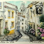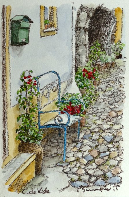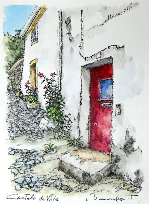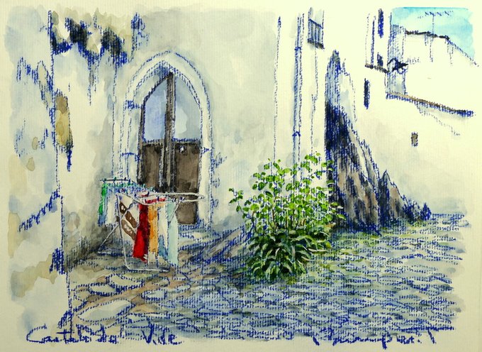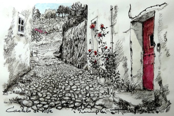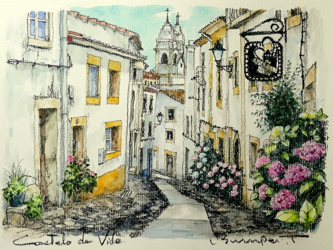黒コンテを活かしきれず、結局、いつもと同じ様に賑やかな色になってしまった。^-^; またいつか違った風景でトライしてみよう!^-^ Castelo de Vide F3号 #水彩画 #ポルトガル #castelodevide