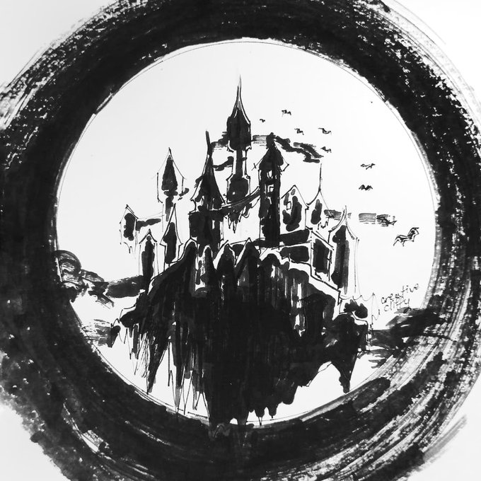 A floating castle I drawn for Day 20 of my #octoberchallenge prompt inspired by #Castlevania #AriaOfSorrow ~ Other prompts are in my Instagram (link in bio 😬) #inktober #drawing #illustration #art #inktober2021 #inkdrawing #inkart #castles #halloween2021 #vampire #Dracula