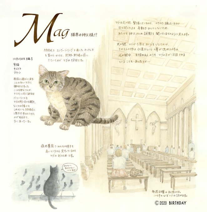ネコ町ナーゴの猫だより マグは教会で暮らす猫です。 マグの仕事は、結婚式でエンゲージリングを通したネックレスを、首からかけて新郎新婦に届ける事。 #ネコ #猫 #猫イラスト #猫あるある #cat #catstagram #cats #catsagram #catillustration