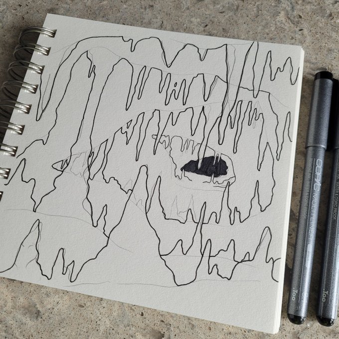 Day 7, #fauntober2022 "Cave System". I had planned on using the brush pen to get increasingly thicker lines towards the foreground but it's 💀 so I used my multiliners. I'll finish this up and share once I'm back home next week. #Inktober2022 #caves