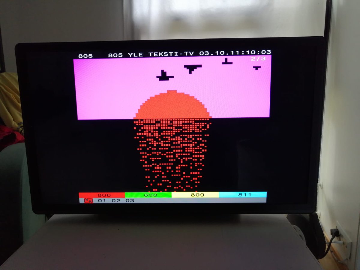 I'm super proud to be on finish #teletext @yleuutiset with my animated piece "Learning to Fly"🐦🌅 You'll find it on page 805: yle.fi/aihe/tekstitv?… Many thanks for this opportunity to @juhavaningen and his Museum of Teletext Art❤📺 #pixelart #videotext #ceefax #textmode
