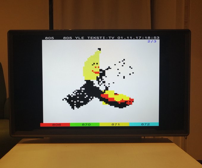 Hehe, big thanks to @juhavaningen and the Museum of Teletext for taping my #teletext banana to @yleuutiset page 805 - it seems to be very happy there 🍌❤️📺 Available for purchase at xcircle.io -> Max Haarich🎨 #pixelart #teletextart #ceefax #videotext #cryptoart