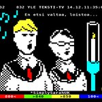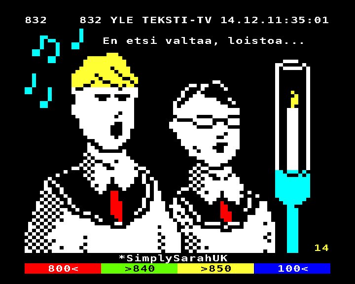 Here's your #choirboys artwork for the Yle #AdventCalendar, @SimplySarahUK! It reminds me of the stuff on #ORACLE and #Ceefax. (I hope the yellows don't show up as orange again...🤣) #teletext #pixelart #christmas #tekstitv #artwork #lores #1bit @russty_russ @grim_fandango