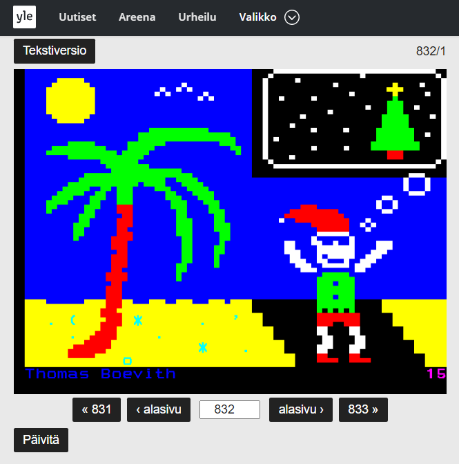Elf-fax Holidays Klaxon courtesy @thomasboevith! On vacation with Yle #Teletext Advent Calendar Day 15. #Christmas #AdventCalendar #pixel #art #digitalart #summer #ceefax #holidays #elf #elfontheshelf twitter.com/ttvmatti/statu…