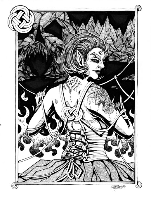 Day 4: Knot "Aztriz the Bound" - 8.5x11, ink on bristol. #inktober #inktoberday4 #inktober2021 #characterart #fantasyart #fantasyinks #inktoberknot #knot #shibari #celticknot