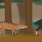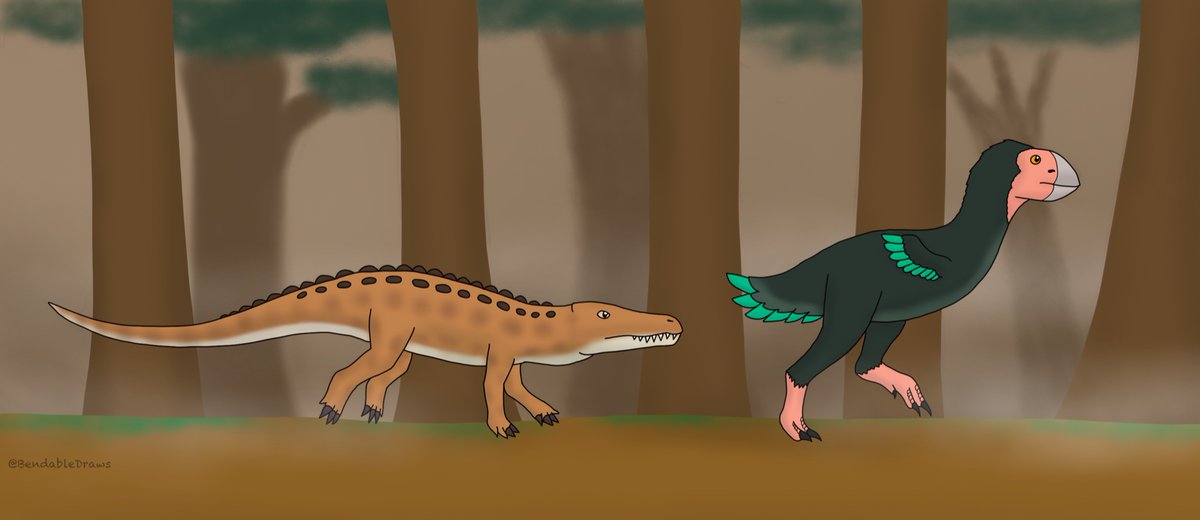 Autumn Footsteps - Middle Eocene, Germany A Boverisuchus chases a Gastornis through the early morning mist. #paleoart #boverisuchus #gastornis #cenozoic #ArtistOnTwitter