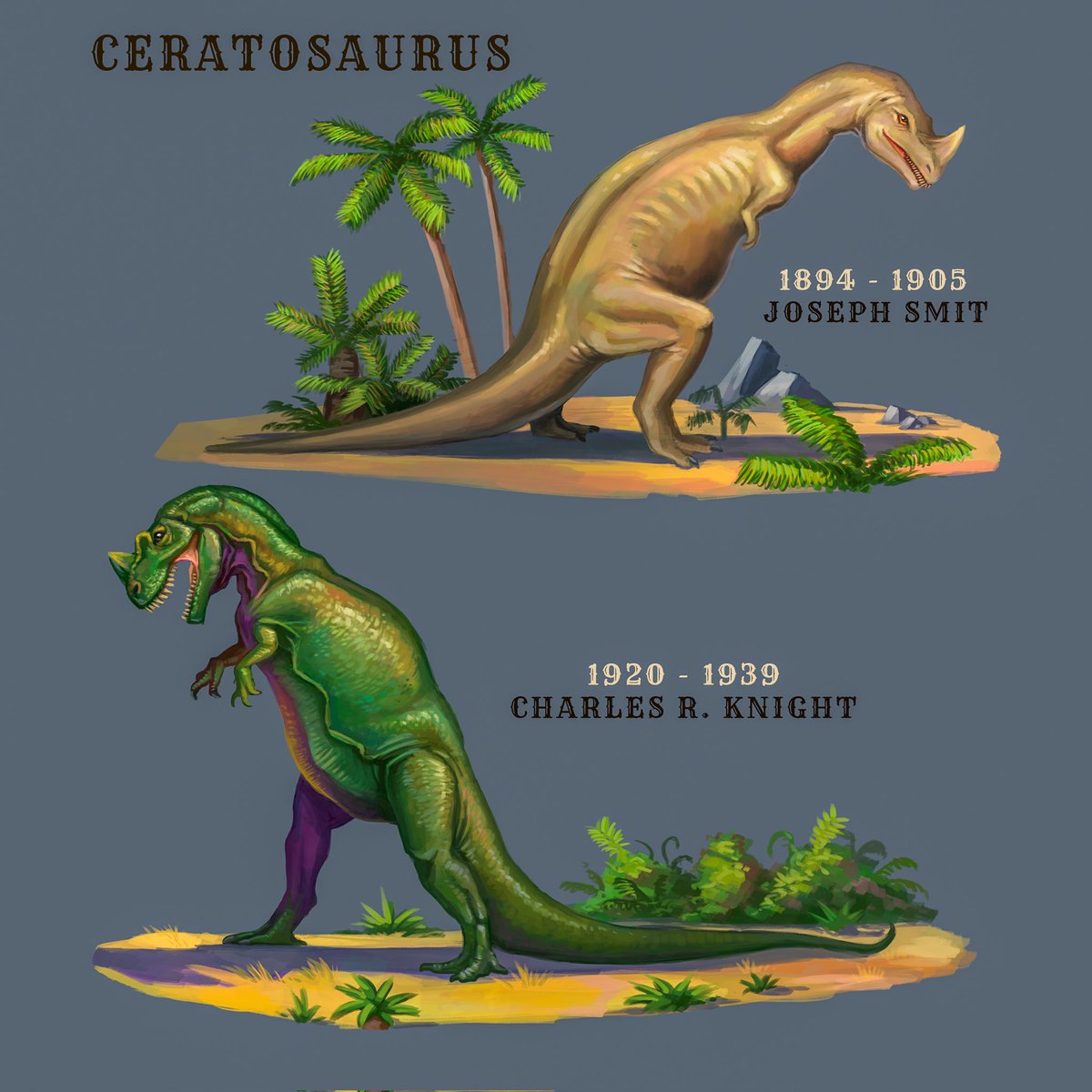 Representações antigas do Ceratosaurus . Releitura das obras de Joseph Smit e Charles R. Knight #ceratosaurus #dinosaurs #dinosaur #paleoart #vintagedinosaur