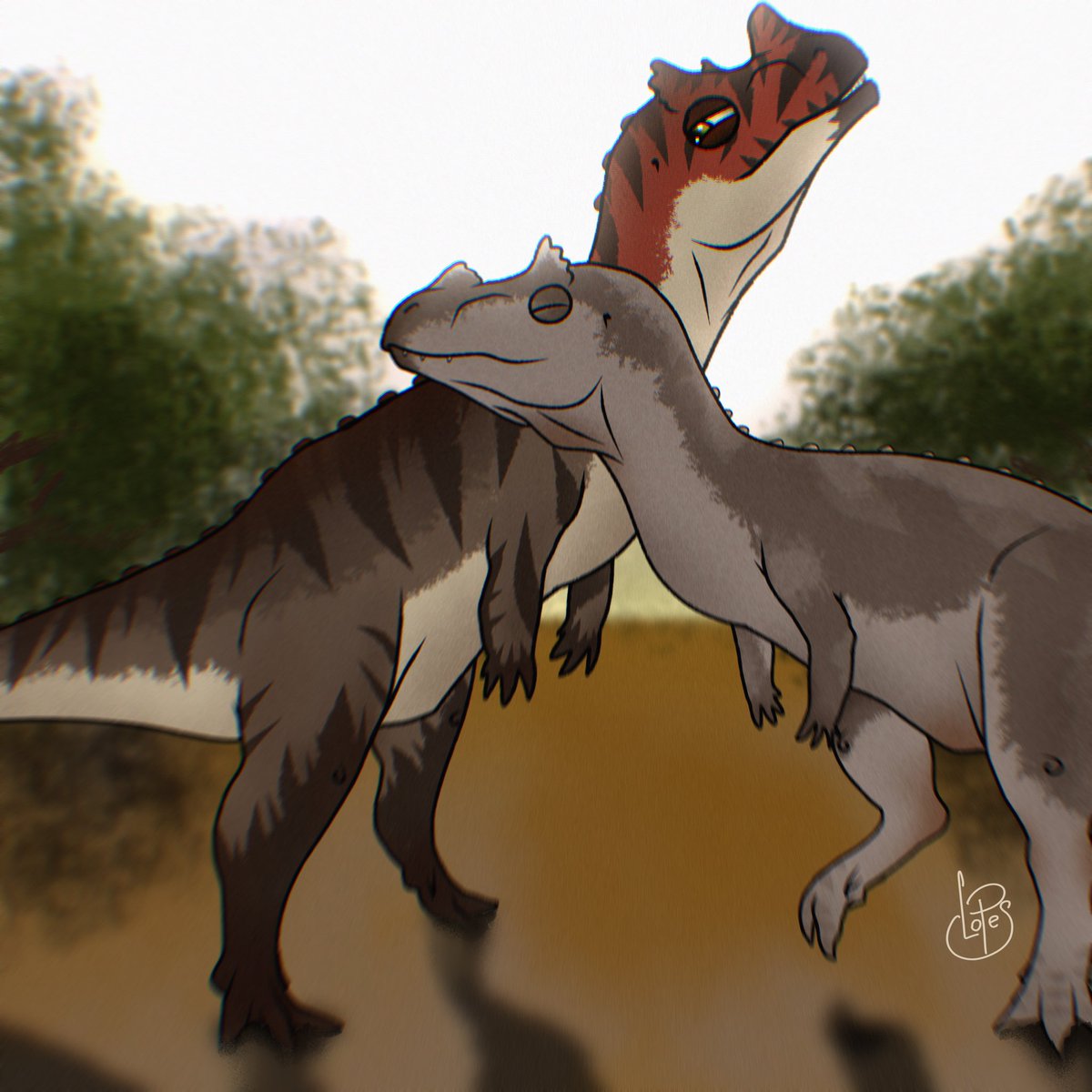 I guess it’s time to repost this, #Ceratosaurus being mobbed by Some unhappy Tanycolagreus. #dinosaurs #paleoart