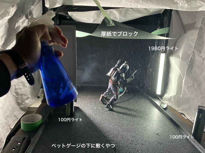 今回はリアルな雨作り。 製品を濡らすわけにはいかない為、アーマーに水滴を少しだけ付け、厚紙でガード。 フィギュアの前方、後方にのみ水が落ちるようにして撮りました。 霧吹きで雨の細さをひたすら調整。 アナログならではのモヤっとした雨の感じが出てたら嬉しいです。 #HotToys #cge_studio