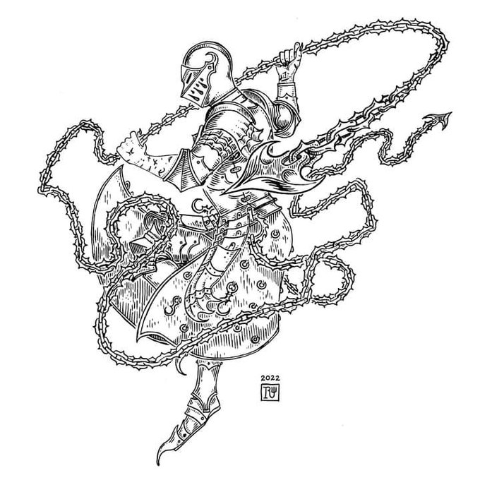 Inkwork for the Chain Dancer, a homebrewed fighter subclass I've been working on. #chaindevil #shadarkai #spikedchain #dnd #dndart #dndfanart #fantasyart #fantasy #gameart #eldenring #darksouls #demonsouls #homebrew #dnd5e #DnDcharacter #pathfinder #ttrpg #rpgart #rpg #gothicart