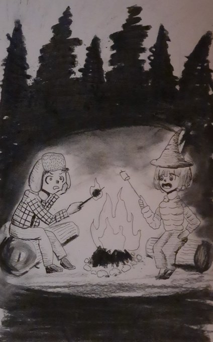 Day 28 of Inktober: Camping #inktober #inktober2022 #inktober2022day28 #camping #art #originalart #originalcharacter #charcoal #inkart #inktobercamping #forest #charcoalart