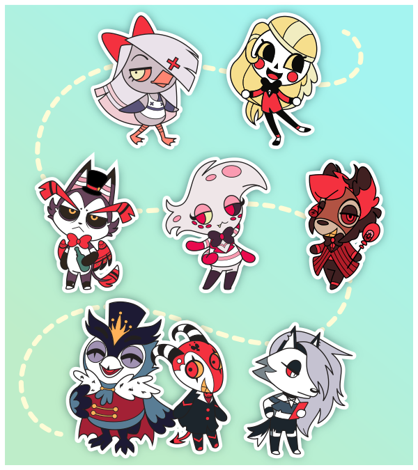 Here are all the #animalcrossing #hazbinhotel #helluvaboss pin designs! I will put them up for pre-order on etsy at the same time I put my extras up for sale. #alastor #hazbinhotelfanart #charliemagne #angeldust #stolitz #hazbinhotelvaggie #stolas #blitzo #hazbinhotelhusk