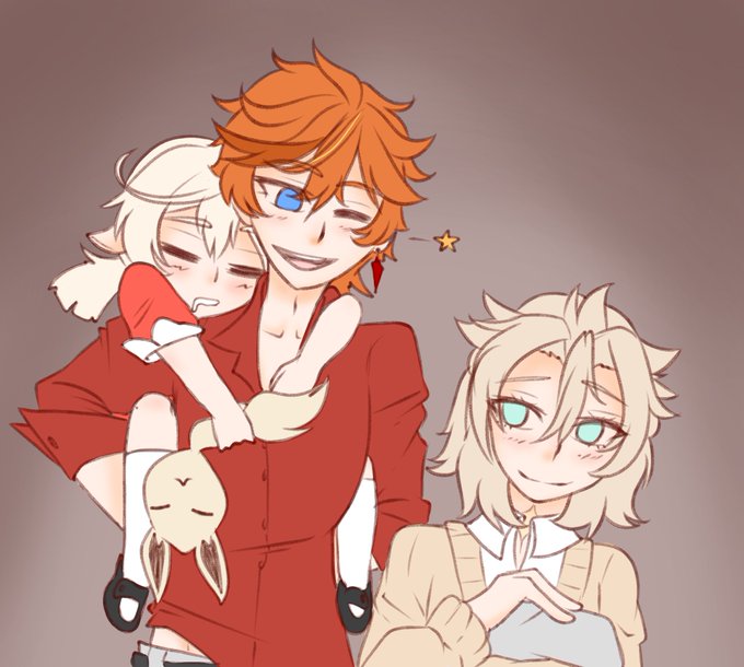 Walking #Klee back home with her big brother #albedo #chibedo #tartaglia #genshinimpactfanart #genshinimpact #doodle #albedoxtartaglia #tartagliaxalbedo