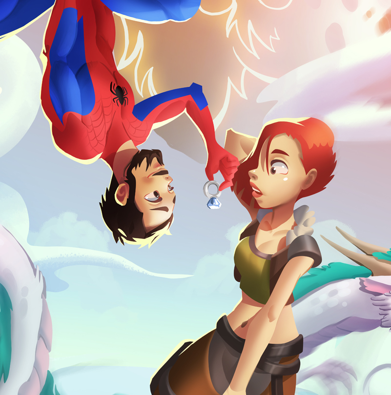 UN HONOR dibujar una ilustración para un momento tan especial. Gracias a @javierlocutor13 por confiar en mi a la hora de hacer un regalo de pedida que atesora vuestras pasiones, momentos especiales y lugares de ensueño a través de #spiderman #chihiro #borderlands entre otros 💚
