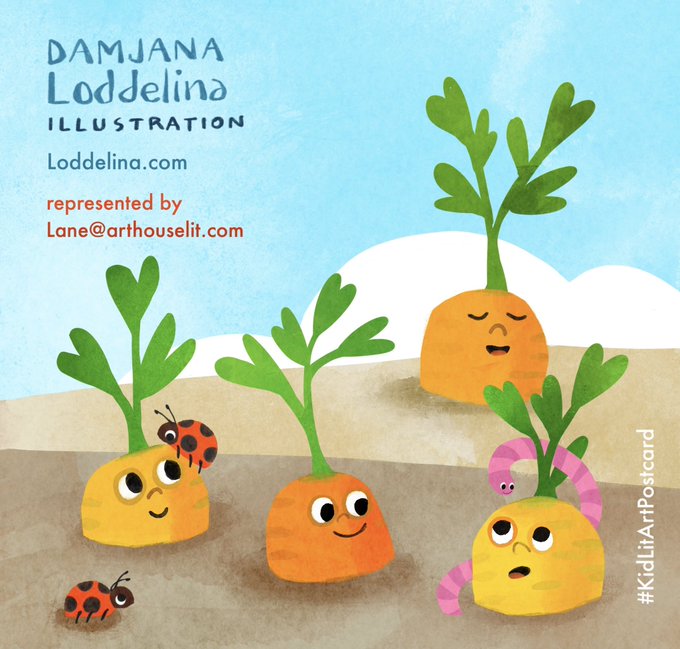 Happy #kidlitartpostcard day! I'm Damjana, children's book author/illustrator, happy to work with you on a fun and colourful project, PB, MG, board books and more 🥕 ✏️ represented by @lanewriteswords 📂Loddelina.com #ChildrensBooks #kidlit #illustration