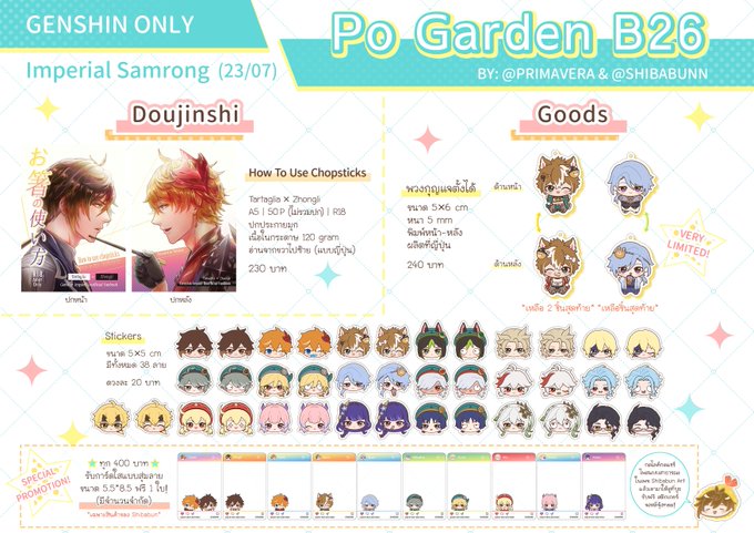 ใบเมนูสำหรับงาน #GenshinOnlyEvent ค่ะ! บูธ B26 - Po Garden Doujinshi 'How to use chopsticks' สามารถอ่านตัวอย่างได้ที่ poipiku.com/2551225/841633… สติกเกอร์รอบนี้มีแบบเคลือบกากเพชรและแบบโฮโลแกรมเพิ่มเข้ามาด้วยค่ะ ไว้จะแปะรูปในเทรดนะคะ #tartali #chiluc #ตลาดนัดเกนชิน