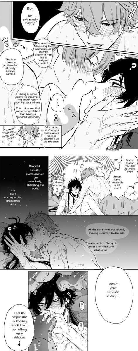 Helped to translate to English! Artist: @Qing11502143 Translation: I realised the translations done by @echoooozyc which I referenced and added on a bit. I hope you don’t mind and thank you! #GenshinImpact #genshinimpactfanart #bl #chlide #zhongli #yaoi #childezhongli twitter.com/Qing11502143/s…
