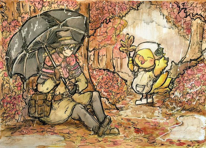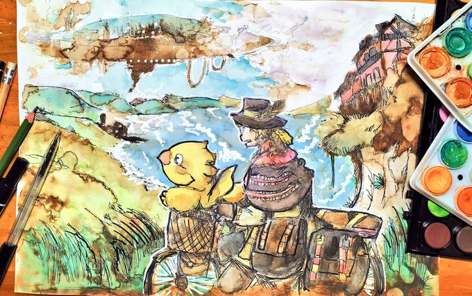 #シド #チョコボ #チョコボの不思議なダンジョン #ファイナルファンタジー #FF #finalfantasy #Cid #アナログ画 #落書き #chocobo 🐤 Chocobo & Cid 🤠 ☔️🍁🥾