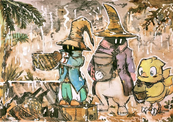 #ChocobosDungeon #ビビ・オルニティア #チョコボ #ファイナルファンタジー #FF #finalfantasy #VIVIOrnitier #アナログ画 #落書き #chocobo 🐤Chocobo & Vivi (Black mage)🧙 🪖🌴⛈