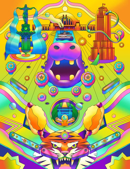 A recent illustration by @scott_balmer for the December issue of Cincinnati Magazine for their "Wizards of Pinball" feature. Explore more: buff.ly/3c0u7kI #illustration #pinball #pinballtable #graphic #retro #vector #cincinnati #landmarks #fionahippo #editorial #color