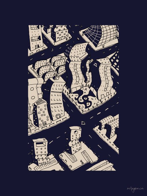 Fantastic #geometric city by Nick Slater. We love the contrasting #shapes, negative spaces and #colors in this piece! Nick is represented by @folioart. Explore more: buff.ly/3PJ3DqX #vectorart #graphic #icons #cityart #urbanpattern #vectorillustration #digitalart