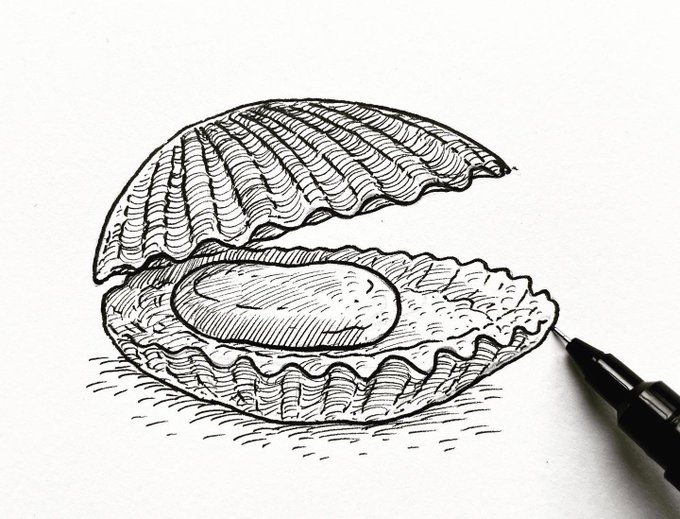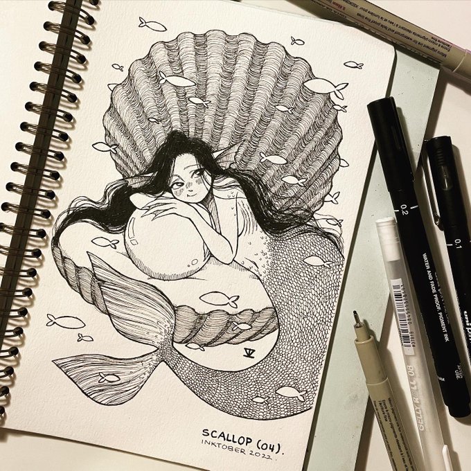 day 4 of inktober 🤠 scallop! which i almost wrote as clam.. i did actually but i gel pened it out 💁🏼♀️ #inktober2022 #inktober2022day4 #inktoberchallenge2022 #clam #mermaid #pearl