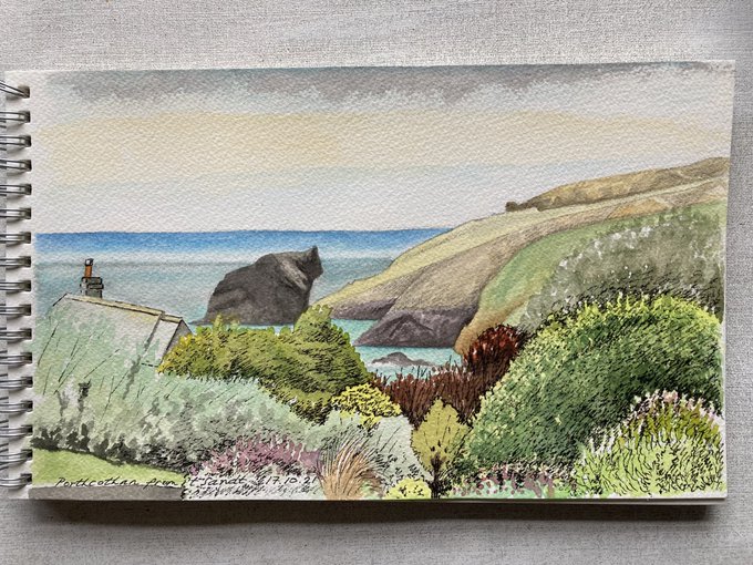 Porthcothan Watercolour & pen in sketchbook #fridaymorning #painting #sketch #artist #ArtistOnTwitter #artistsoninstagram #Cornwall #coast