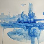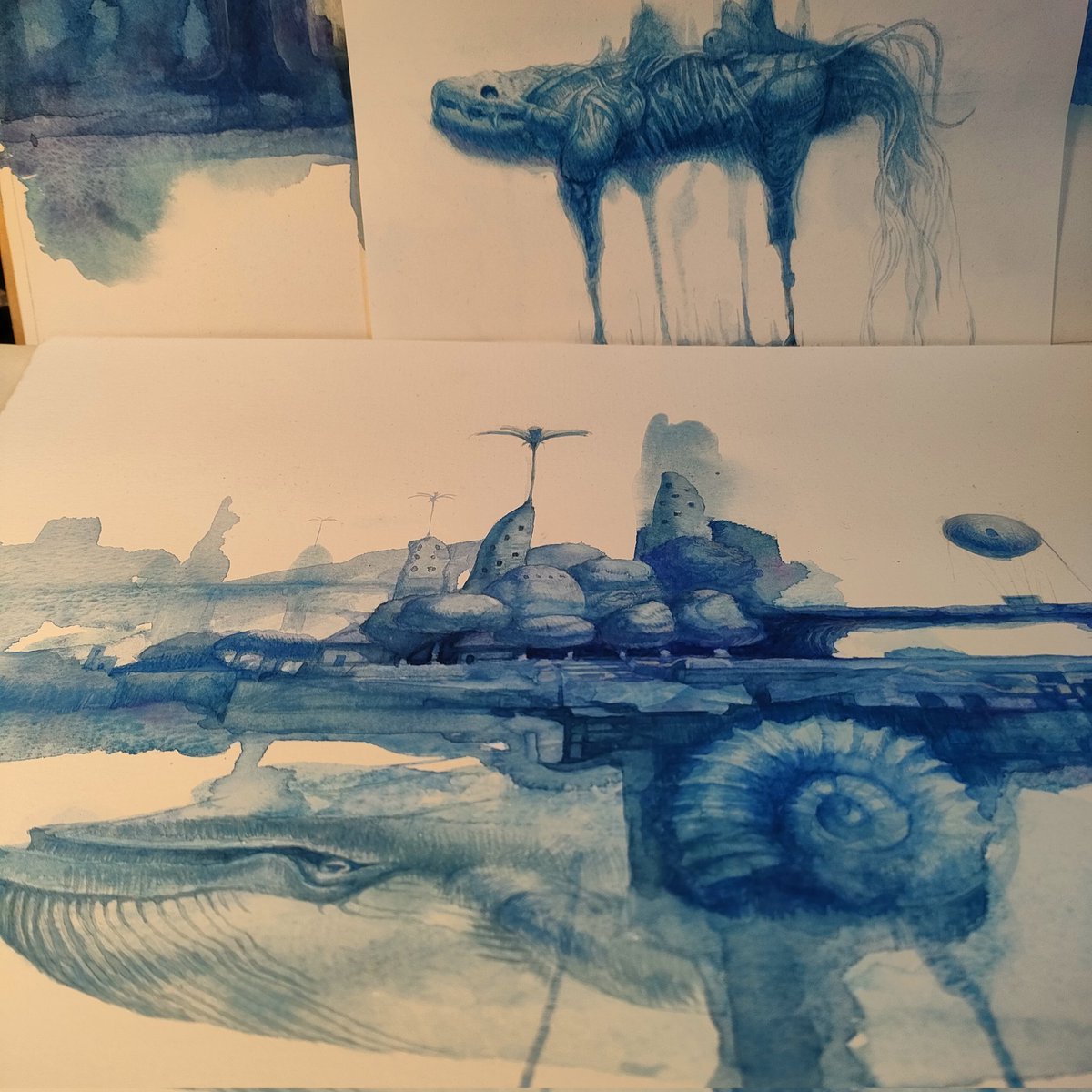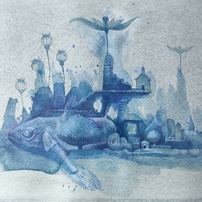 「Haven・安息の地」f6・紙 海にもいきたいな〜。クジラも見たい。制作中 #art #watercolor #青 #透明水彩 #blue #art #illustration #シュールリアリズム #surrealism #chrysalis #アンモナイト #ammonite #シーラカンス #coelacanth #クジラ #whale #シロナガスクジラ