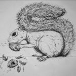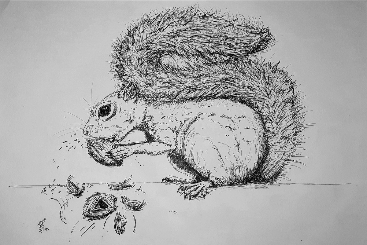 Dia 18 #inktober2022 #Inktober #colab55 Raspar Vamos de Caxinguelê (Sciurus aestuans) raspando os dentes no coquinho Jervá (Syagrus romanzoffiana). Ele usa os dentes como cinzel e faz buraco triangular para acessar a poupa. @lucaskias @PattiMariella @wtfdriks @mairamezza