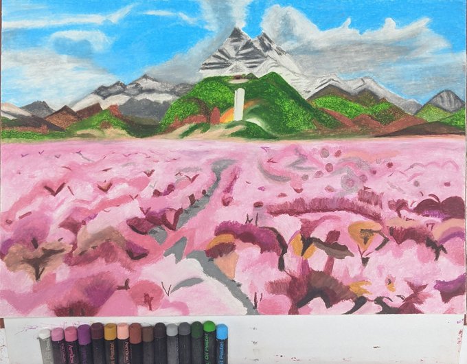Walk to Four Seasons Manor 🌸💮 #oilpastel #art Favourite scene from #WordOfHonor #fourseasons #colorfulabstract #fanart #mountain #Blossom #pastellove #colourful #naturelovers #landscape #landscapelovers #fantasy #dream #scene