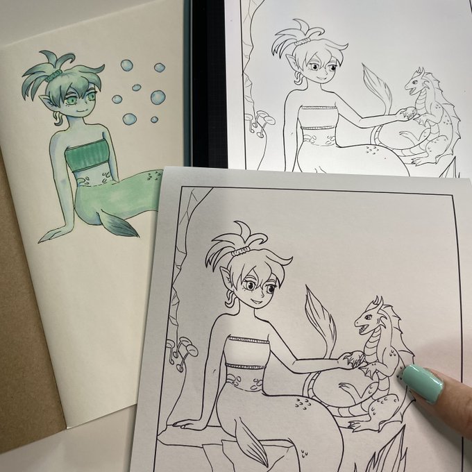 From a traditional sketch, to digital linework, to print - I've now uploaded a new colouringpage to my Ko-fi Shop, another mermaid for mermay! and look at that cute little serpent! ko-fi.com/s/d9feb1db60 #mermay #colouringpage #kofishop