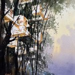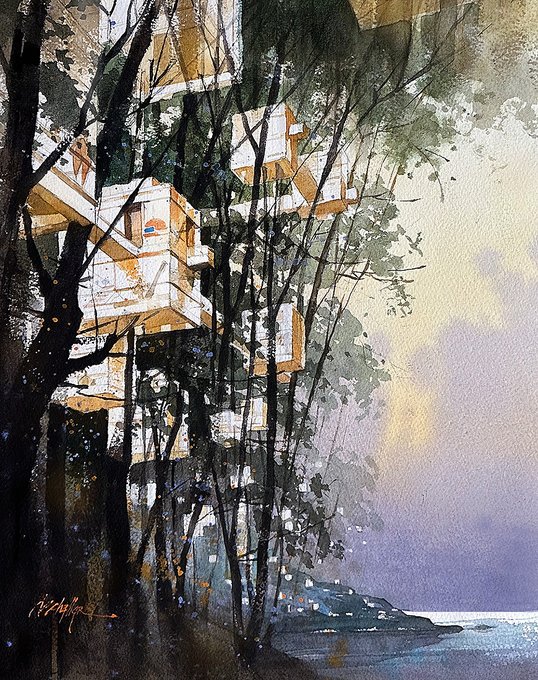 Firefly Houses" Live demonstration today for Watercolor Live -Exploring boundaries between reality and imagination - luminous, translucent houses floating in a great forest #watercolorart #watercolorlive #streamline #imagination #art #architecture #design #composition #painting