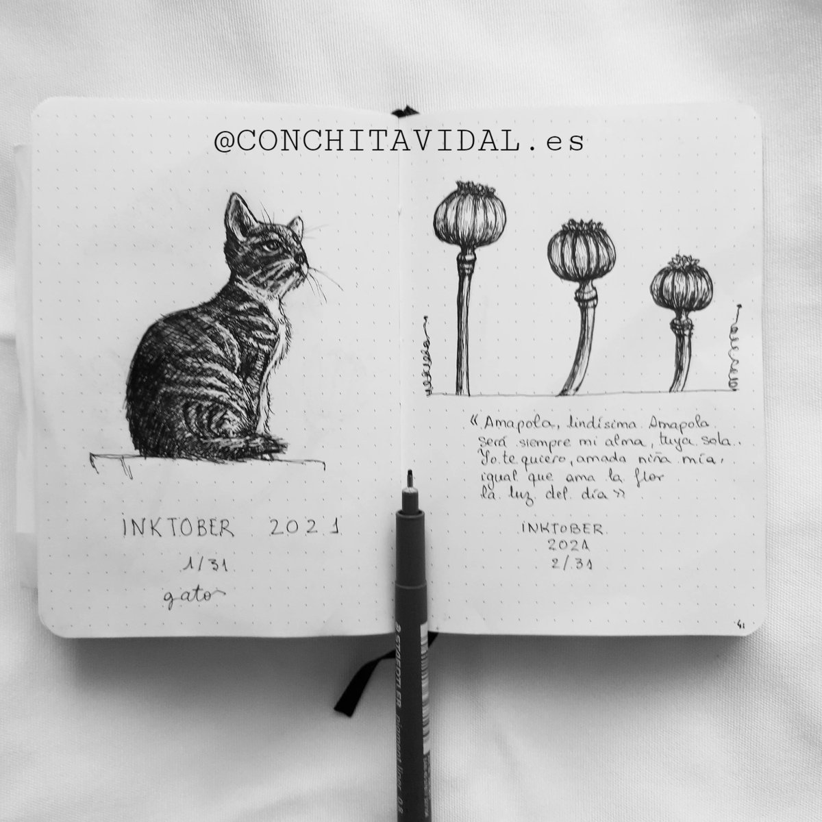 Inktober2021, días 1-2/31 ________________________ #inktober #ink #sketchbook #illustration #animal #nature #conchita #conchitavidal #tintubre #tinta #inktober2021 #cat #Poppy