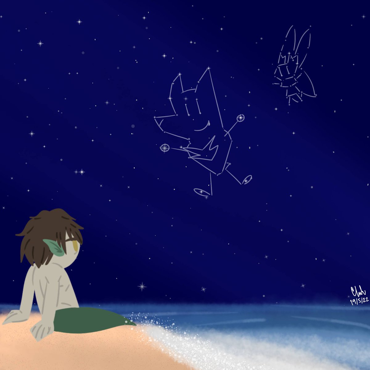 Here's my drawing for #mermayday18 - Stars! Yuuto sure sounds like the kind of guy who enjoys watching the night full of stars, with some odd constellations! Yuuto is owned by @MysticNovaMN #mermay #mermay2022 #mermaychallenge #stars #constellations #fanart #originalcharacter