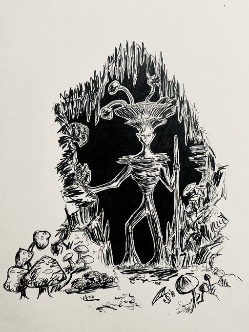 Day 5 of Inktober: Cave entrance, puppet and puppet master, Magick garden #inktober #drawtober #cordyceps #buildaworldin31days #weirdtober #ink #mushrooms #fungi #funguy