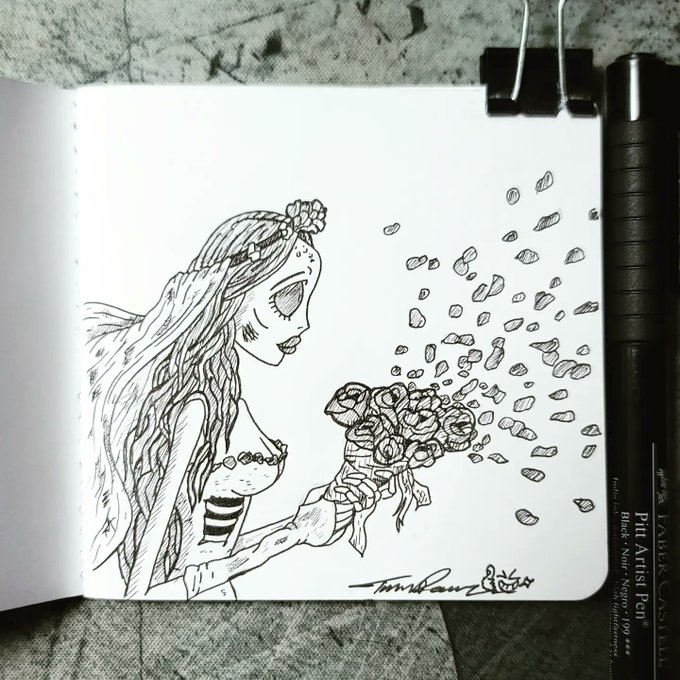 DAY 6: Bouquet "I spent so long in the darkness... I'd almost forgotten how beautiful the moonlight is!" ~ Emily (Corpse Bride) #art #inkart #inktober #inktober2022 #inktoberday6 #bouquet #corpsebride #corpsebridefanart #disney #timburton #Halloween