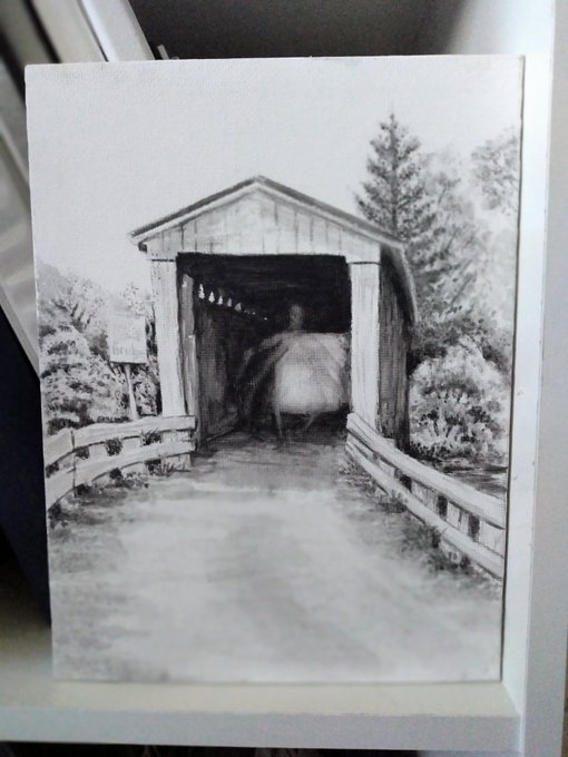 A #TerrorTuesday #Throwback to my #creepy #cryptid #blackandwhite #coveredbridge #goucha #painting #artwork What toll do you think it requires for passage? #ArtistOnTwitter ☠