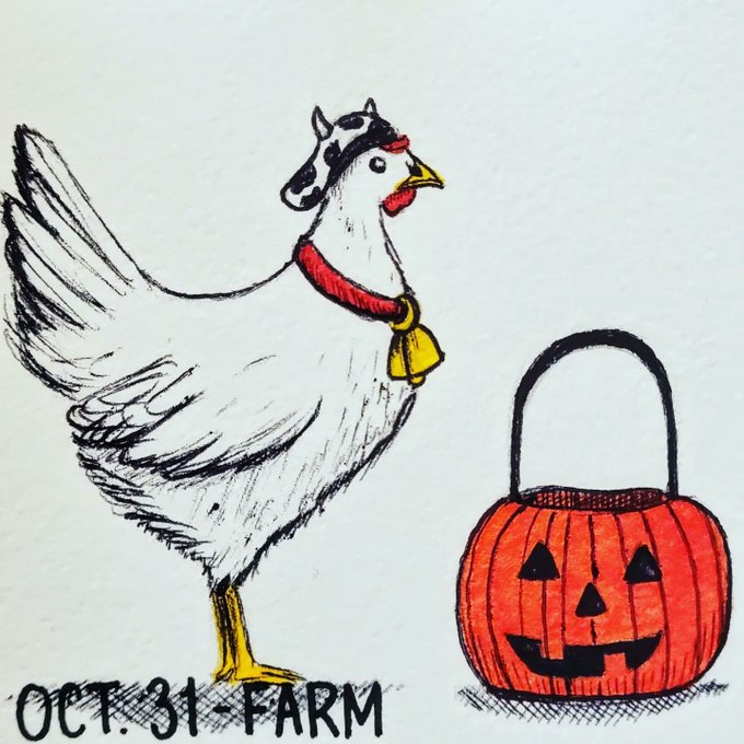 #Inktober Day 31 - #Farm This #chicken is udderly delighted to go trick-or-treating! Happy Halloween! 🐔🎃 #inktober2022 #chickens #cows #halloween #halloween2022 #halloweencostume #trickortreat