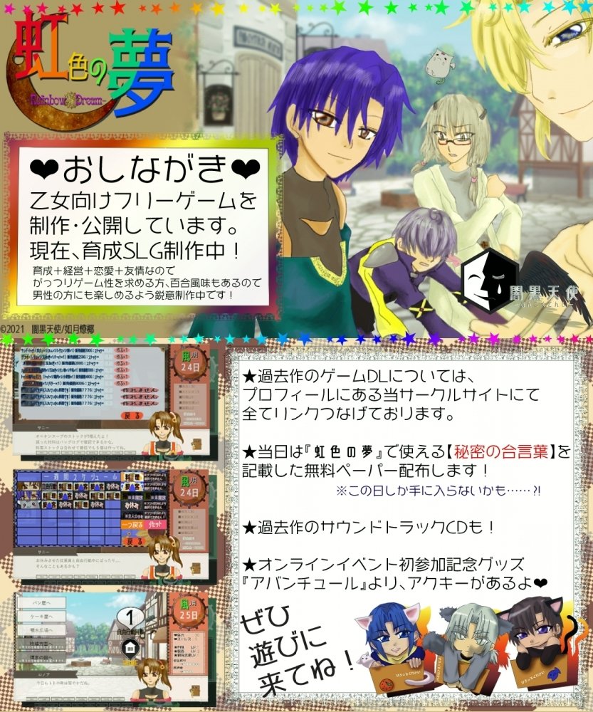 #crAsMMビジュアルノベルオンリー 明日です!!(前日にバタバタw) 過去作のサントラCDなどございます~! 新しいのは無料ペーパーぐらいですが、【虹色の夢】の攻略キャラクターの一人、リンクのSS付きなのでよかったら貰いに来てください~! 二週間早いクリスマス仕様でお待ちしております~❤