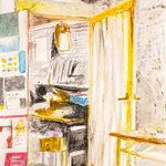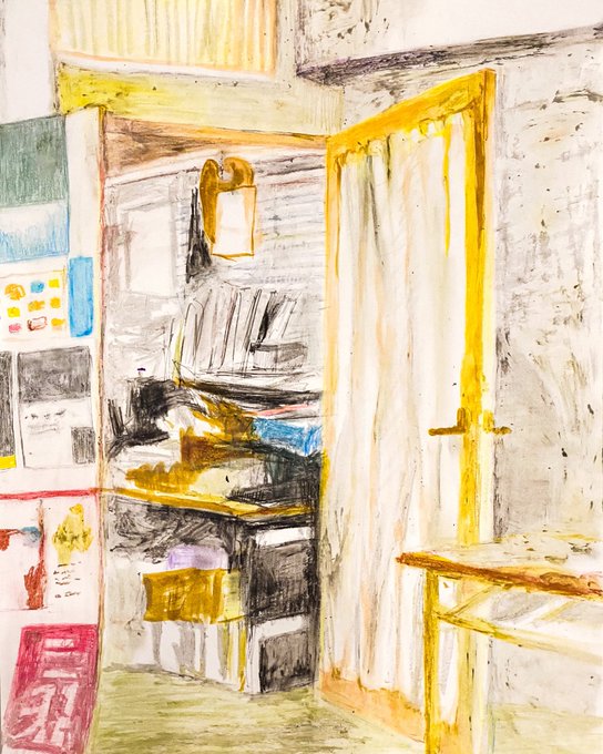 この絵は今日画廊のオーナーさんから頂いたケント紙のスケッチブックB3に、持参した色鉛筆とクレヨン、筆ペンでその場で描きました ごちゃっとした所がポイント! #art #mixedmedia #colorpencildrawing #crayondrawing #brushpendrawing #アート #色鉛筆画 #クレヨン画 #筆ペン画 #ミクストメディア