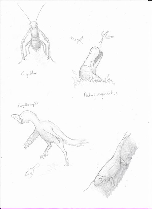 Sketches from last night´s #paleostream Gigatitan, Mahajangasuchus, Corythoraptor and Pederpes #paleoart #sciart #dionasurs #insect #gigatitan #croc #mahajangasuchus #corythoraptor #pederpes